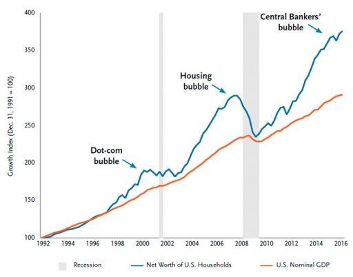 The extreme central bank policies have resulted in one thing: a next gigantic asset bubble. This bubble, like any other, can end in one way and one way only: in a massive crisis. This is a chart with US GDP growth (orange line) and the net worth of US households (blue line), which consists of stock portfolio's, home equity, savings accounts, etc. minus any household debt). Again, we are gazing into an abyss.