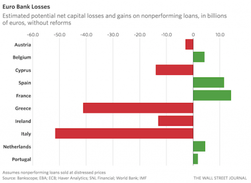 And in the meanwhile the European banking sector has not been cured yet. Despite record low financing costs, despite the extreme policy of the ECB, despite everything delinquency rates on bank loans is starting to creep up. Non-performing loans on Italian banks' balance sheets are a case in point. This chart is an estimate of the losses that still have to be taken. Will the euro be able to survive?