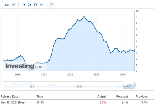 Yesterday, the United States' inflation figure (CPI) for May was announced. The expected inflation rate was 3.4%, the same as the previous month, but the figure came in at 3.3%. This indicates a decrease in inflation, which might provide room for interest rate cuts.