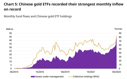 In April, the demand for Chinese gold ETFs exceeded all expectations, with an inflow of 9 billion RMB (US$1.3 billion). This led to a record high total of assets under management, reaching 46 billion RMB (US$6.4 billion) and an increase in holdings by 17 tons to 84 tons. Additionally, Michael Burry, the American hedge fund manager known for predicting the 2008 financial crisis, has added gold to his portfolio. Gold is now his fifth largest position.