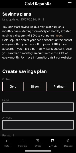 Do you want to build passive wealth using the Dollar-Cost-Averaging (DCA) strategy? Consider opening a savings plan. This can be easily done through the GoldRepublic app!