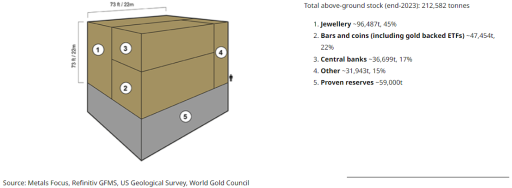 The well-known gold cube is back, but this time we're focusing not on its dimensions but on the distribution of all above-ground gold. Over the years, the percentages have undergone interesting changes. Below is a table with the percentages of above-ground gold usage in 2016 and 2024:
