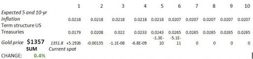 I also tried another model. As I have showed earlier in response to an article published by Lawrence Summers (1988), we could also view the gold price as the inverse of the interest rate. Summers showed that when returns on capital markets are low, returns on gold tend to be high. This relationship is quite stable. Any increase in gold prices would simply be the inverse of the negative real returns on capital markets. When real returns are positive, gold prices would fall. This approach, however, appears to be doomed to fail and seems to yield no sensible valuation. A model I developed deduced from Summers´ 1988-paper, leads to very slight changes and forecasts that (in this case, a price increase of 0.4%) do no justice to the real observed price volatility of gold.