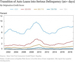 “After years of growth among borrowers across the credit score spectrum, 2018’s strength in auto loans was primarily driven by those originated by the most creditworthy individuals, while originations to those with scores below 720 have leveled off, albeit at high volumes. The high volume of prime originations has caused a quality-shift in the outstanding pool of auto loans and, as of the fourth quarter of 2018, 30 percent of the $1.27 trillion in outstanding debt was originated to borrowers with credit scores over 760.