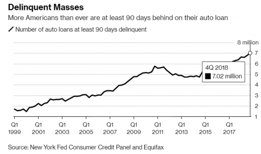 In other words, the number of outstanding auto loans that are at least 90 days late reached an incredible 7 million loans at the end of last year. Remember that roughly 300 million people live in the United States. This is the highest number of loans with late payments since 2012.