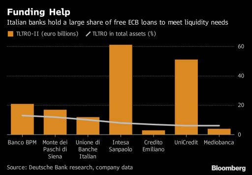 Italian banks have resorted massively to TLTRO at an earlier occasion and apparently cannot do without. To avert a financial crisis, Draghi took the decision to make the TLTRO facility available again. Source: Bloomberg