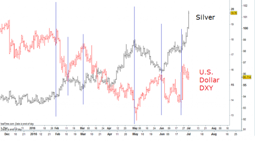 <p>Since February 2016, the day the impressing rally in silver prices began, the silver price shows an almost perfect (inverse) correlation with the dollar index.</p>