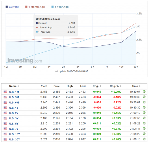 The current yield curve in the United States: the 3-month rate is higher than the 10-year Treasury rate. Source: Investing.com