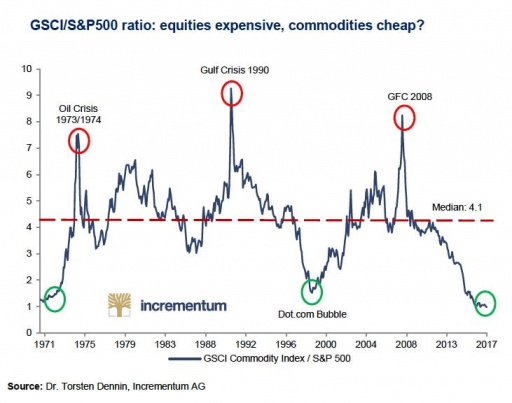 This week I stumbled upon an interesting chart. In this chart, the Goldman Sachs Commodity Index (GSCI), an index tracking the prices of a basket of commodities, is contrasted with the S&P 500 index. This gives us the GSCI/S&P 500 ratio. Whenever the GSCI/S&P 500 ratio is high, we are paying relatively little for stocks in terms of commodities. Conversely, if the ratio is low, we are paying relatively much for stocks relative to commodities. What does the ratio imply right now? Is this the moment to invest in precious metals?