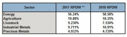 From the above chart, we can conclude that we most likely cannot equate the commodity index with the precious metals market. Energy (in particular oil and natural gas) has a large weight in the composition of the GSCI index. Precious metals only account for 5% of the GSCI index.