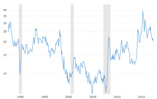 Despite the fact that oil and gold prices are generally strongly correlated with each other, is the range between both prices fluctuate pretty ample. Let us therefore for a moment look at the gold/oil ratio. The gold/oil ratio can be derived rather simply by dividing the gold price by the oil price.
