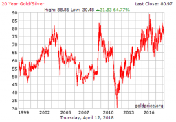 The gold/silver ratio. Source: Goldprice.org