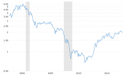 s&p 500/Gold-Ratio. How much gold is needed to buy an index? Source:macrotrends.net