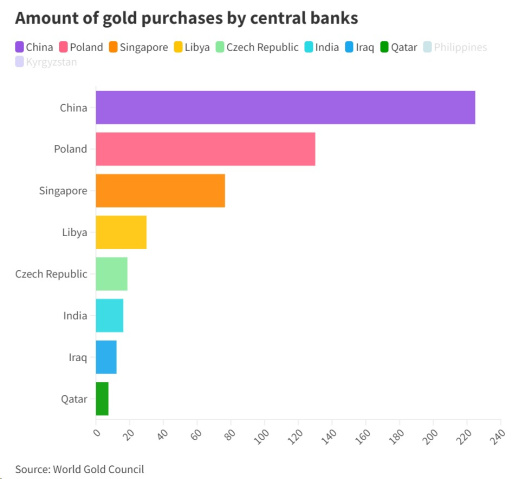China is the main driver behind both consumer demand and central bank gold purchases, and the country is unlikely to slow down its acquisitions. Among all central banks, the People's Bank of China was the largest gold buyer in 2023. China's weak economy and challenges in the real estate sector have driven more investors towards the safety of gold, with continued strong individual investment in gold, according to the World Gold Council. Below is an overview of the central banks that have bought the most gold in 2023.