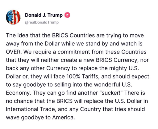 The unpredictability of Trump's trade policy was further highlighted by a threat towards countries that want to get rid of the US dollar as an international trade currency. Trump warned that such countries can expect import tariffs of up to 100%.