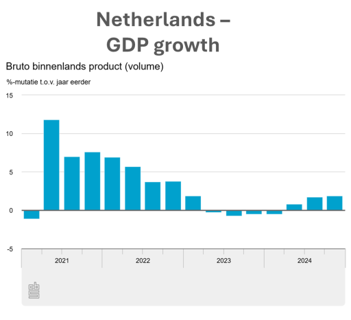 Finally, news from the Netherlands. The economy grew by 0.4% in the fourth quarter of 2024, bringing annual growth to 1.0%.