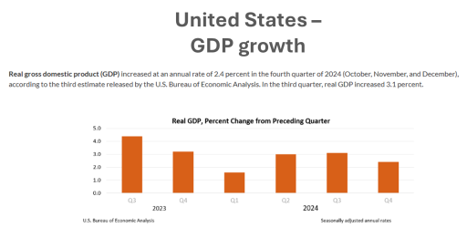 Meanwhile, the US economy's fourth-quarter growth rate for 2024 remained solid at 2.4%. Most notable was the 5.9% rise in corporate profits, the strongest increase in over two years. Consequently, the US economy started 2025 with momentum, but there are doubts about how companies will react to the trade stress that is increasingly prominent this year.