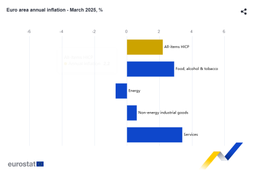 Eurozone inflation fell to 2.2% in March, a tenth lower than in February and in line with average expectations. Services inflation fell to 3.4% from 3.7%, and underlying price pressures also eased slightly.