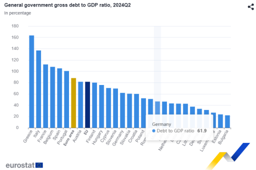 This means Germany is partially moving away from the debt brake, a constitutional rule that limits German government spending. The debt brake has allowed Germany to have much less debt than other European countries such as France and Italy, but at the same time has limited economic growth.