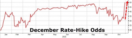 Using information provided by futures markets, CME calculates the likelihood that the Fed will raise interest rates upcoming December. Earlier this month, it was estimated to be 26%. But since Wednesday, it has shot up to 50%!