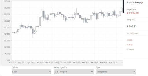 We are still 31% away from the 2011 'peak' of €1,050 per kilo. Looking at the peak, adjusted for inflation, the price is even higher. Moreover, I have pointed out several times the interesting dynamics of the gold/silver ratio. This ratio is currently 87, meaning 1 kg of gold is currently 87 times as expensive as 1 kg of silver. In April 2011, this ratio was only 31. Should the gold price remain at its current level - which is not at all strange considering the macroeconomic situation - and the gold/silver ratio drop to 31, this would mean a silver price of €2,189 per kilo, a potential 173% increase! However, it's important to realize that investing in silver is more speculative than gold, partly because silver prices have been/are long influenced by the paper market. For those interested in purchasing physical silver, this can easily be done via our website or app, giving you access to the current rates at all times.