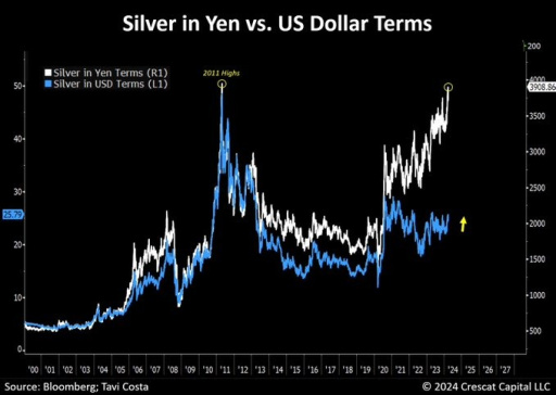 Interestingly, the silver price, when expressed in Yen, is close to reaching its 2011 peak. In US dollars, silver is currently priced at $27 per ounce, with a record high of $50. Should the US dollar weaken further as silver approaches its 2011 peaks (in dollars), this could lead to nearly a doubling of the current price.