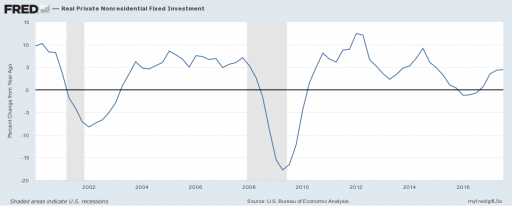 Above chart comes straight from the GDP report of the Bureau of Economic Analysis (BEA). Historically, capital investment (CapEx) has always been positive in times of positive economic growth. But about a year ago, something unexpected happened. CapEx was negative even though the economy was not in a recession. Since recently, growth in CapEx has been slightly positive, but is still way below its historical average (especially after the drop in CapEx during the crisis).