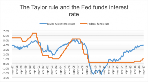 According to the Taylor rule, the Fed had to lower interest rates to negative after the 2008-recession, something the Fed was not willing to do. But since 2012, ever since the Taylor rule returned to recommending a positive Fed rate, the Taylor rule could easily be upheld.
