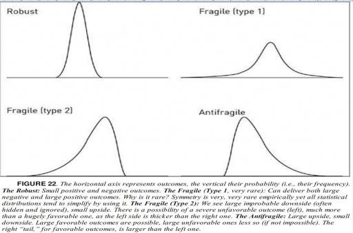 The robust, fragile and antifragile: robust investments have little downside and little upside, whereas fragile investments have a lot of downside but little upside. Antifragile investments have a lot of upside and a limited downside and therefore gain from volatility rather than being harmed by volatility.