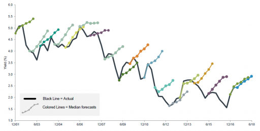 In the above chart, the black curve is simply the rate on 10-year US Treasuries. That interest rate dropped recently (as we will see later) to below 2.8%. On the other hand, the colored lines are the median forecasts that have been made year in and year out. What surprises, is that analysts consistently think that interest rates will rise and, moreover, predict that government yields reach the 3% barrier within no-time. Nonetheless, nothing could be further from the truth over the past years.