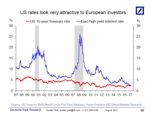 Deutsche Bank has taken the yield on 10-year US Treasuries (which are considered “risk free” assets) and the yield on risky Eurozone bonds. Oddly, for the first time ever, the yield on the latter has exceeded the yield on US sovereign debt. How is that possible?
