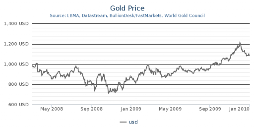 The gold price since the Bear Stearns bailout (March 2008) until 2010. Source: World Gold Council